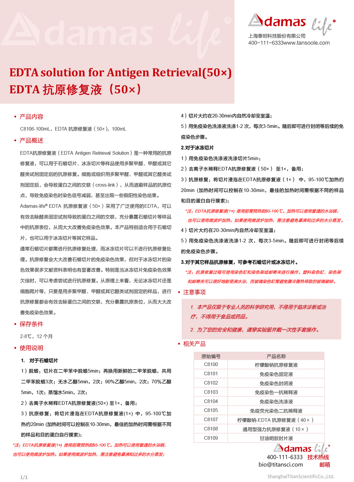 EDTA抗原修复液 (50×)|EDTA Solution for Antigen Retrieval (50×)|Adamas life|100 mL