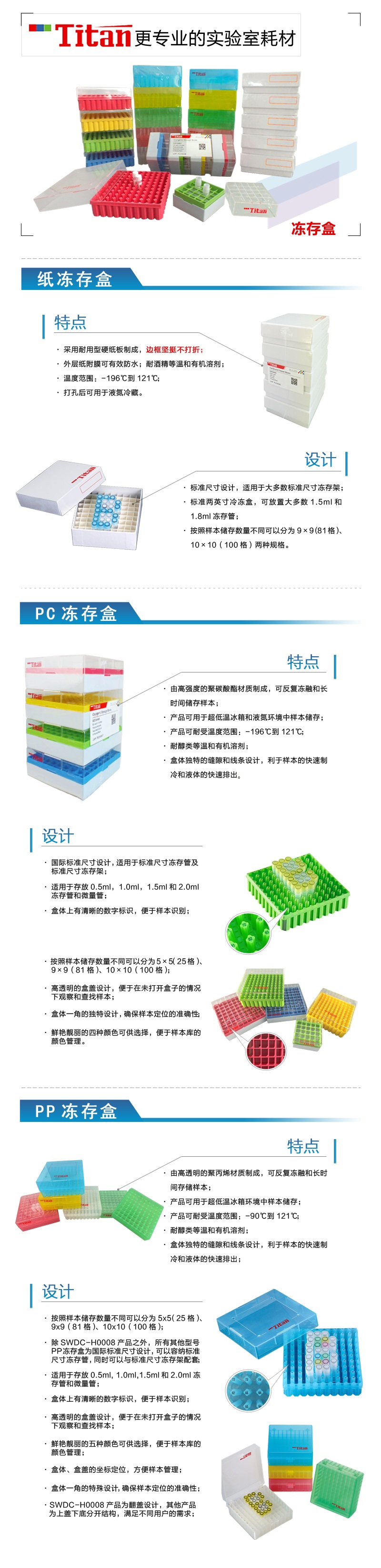 1、由高透明的聚丙烯(PP)材质制成,可反复冻融和长时间存储样本;
