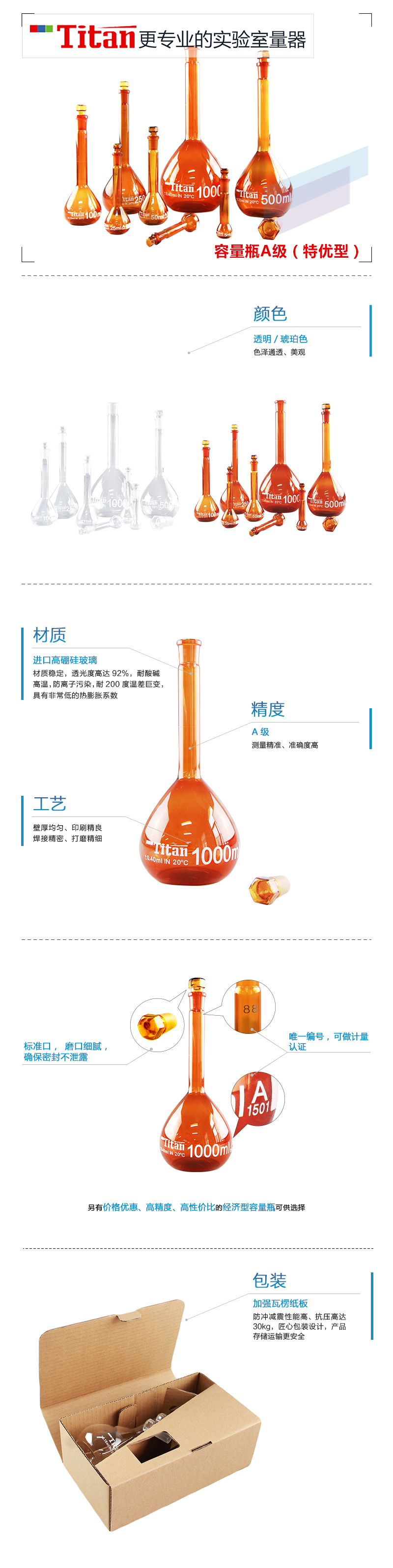 容量瓶(A级)1000ml 琥珀色 特优级 包过检