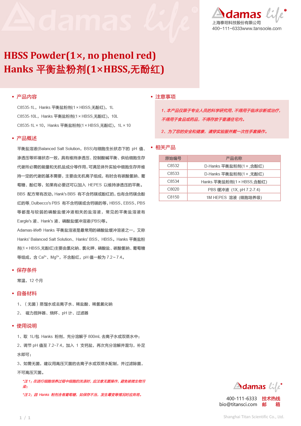 Hanks平衡盐粉剂 (1×HBSS, 无酚红)|HBSS Powder (1×, no phenol red)|Adamas life|1 L×10