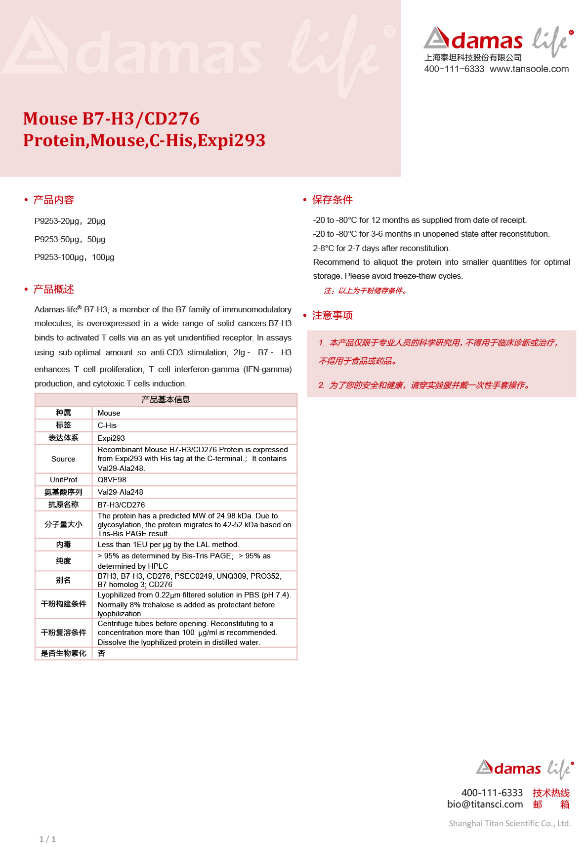 重组蛋白Mouse B7-H3/CD276 Protein, Mouse, C-His, Expi293|Adamas life|50 μg