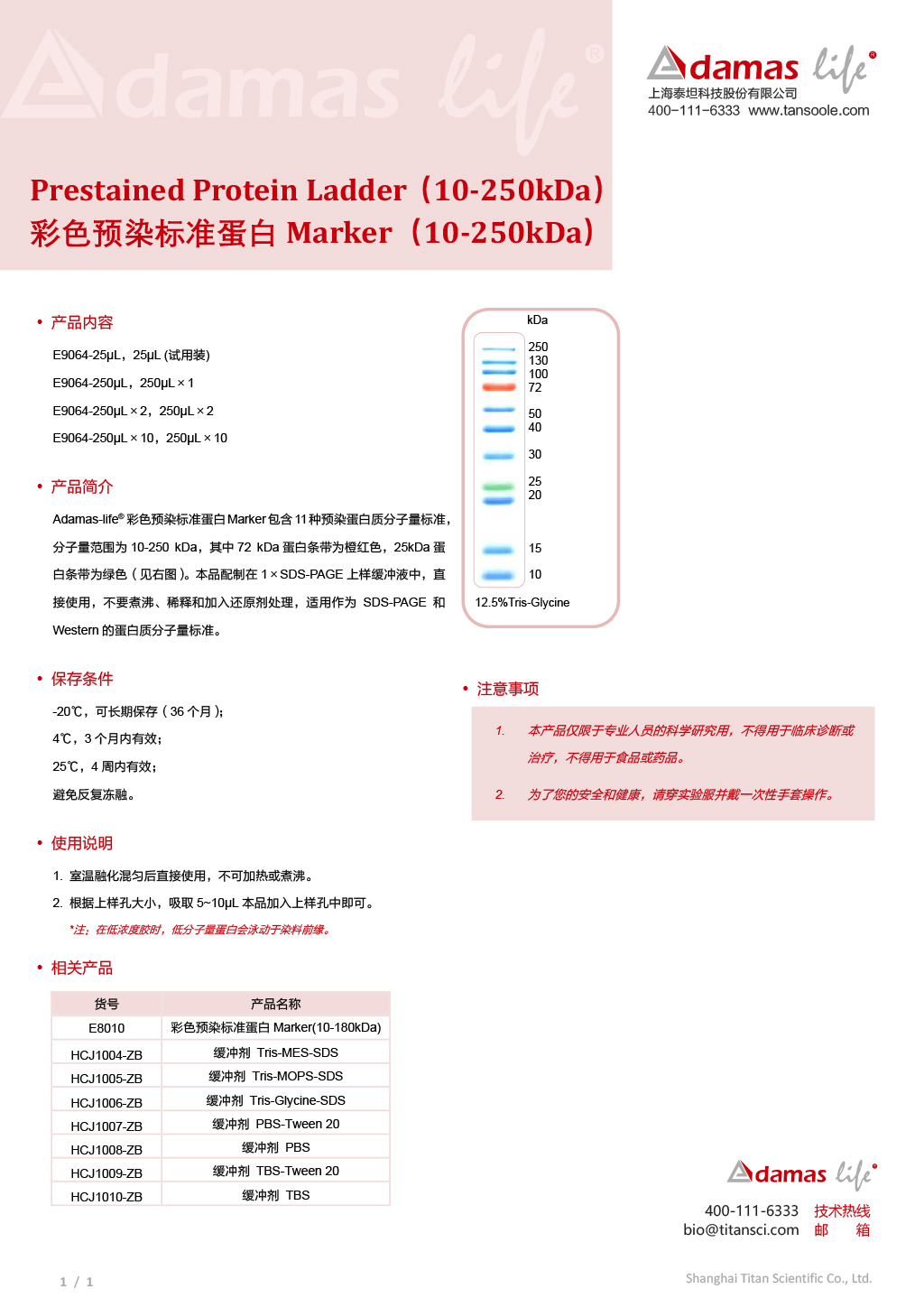 彩色预染标准蛋白Marker (10-250kDa)|Prestained Protein Ladder (10-250kDa)|Adamas life|250 μL
