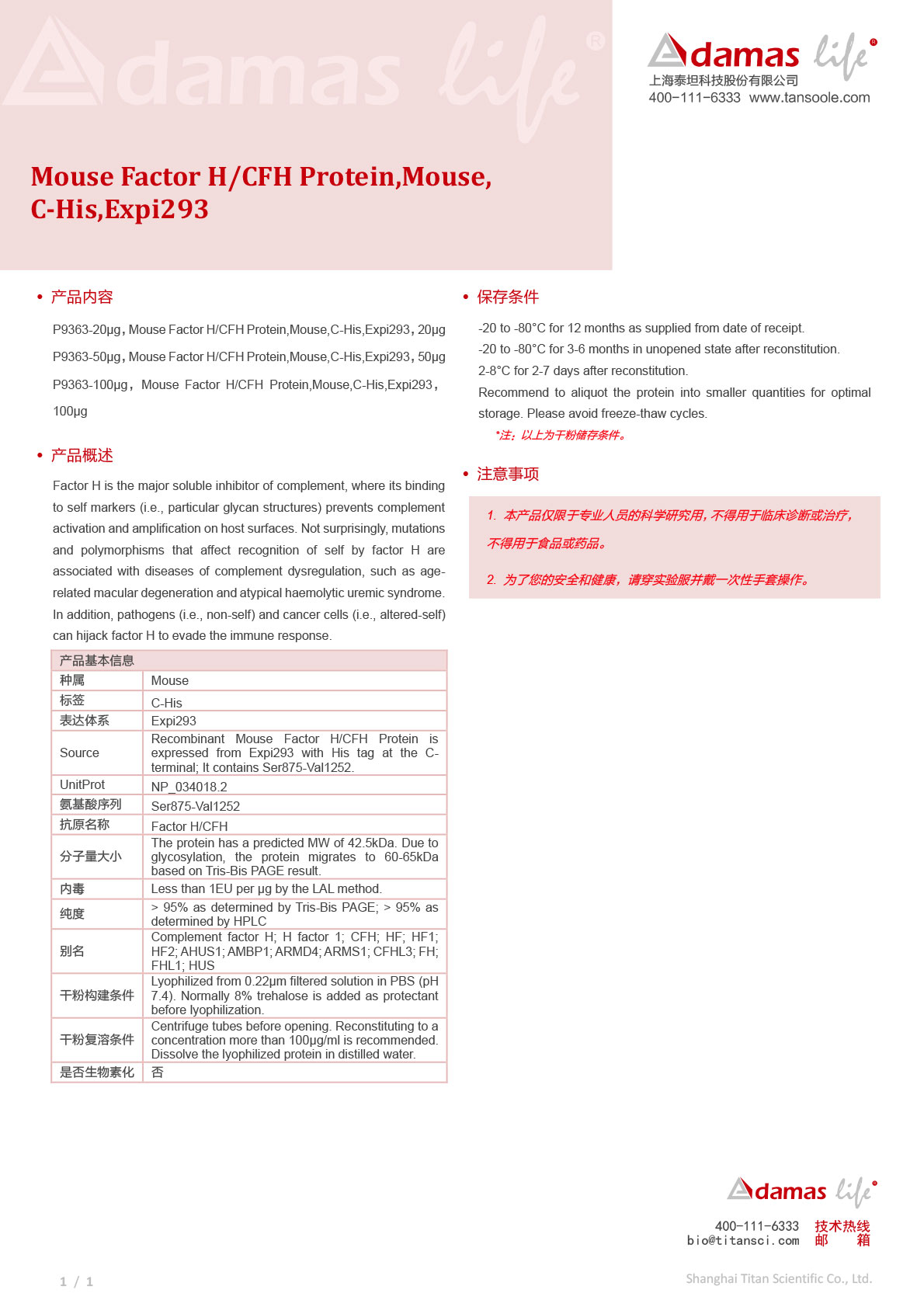 重组蛋白Mouse Factor H/CFH Protein, Mouse, C-His, Expi293|Adamas life|50 μg