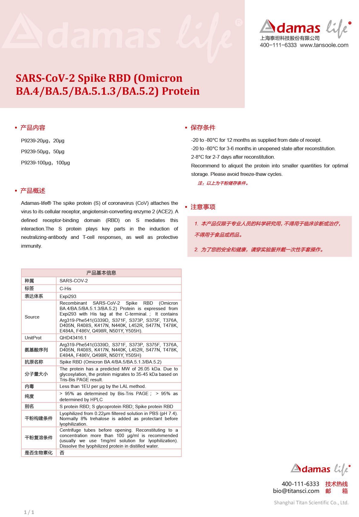 重组蛋白SARS-CoV-2 Spike RBD (Omicron BA.4/BA.5/BA.5.1.3/BA.5.2) Protein, SARS-COV-2, C-His, Expi293|Adamas life|20 μg