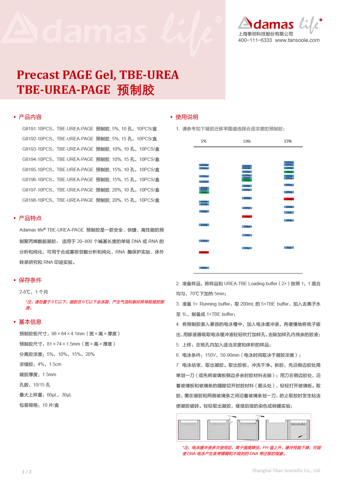TBE-UREA-PAGE 预制胶, 20%, 10孔|Precast PAGE Gel, TBE-UREA, 20%, 10wells|Adamas life|10 PCS