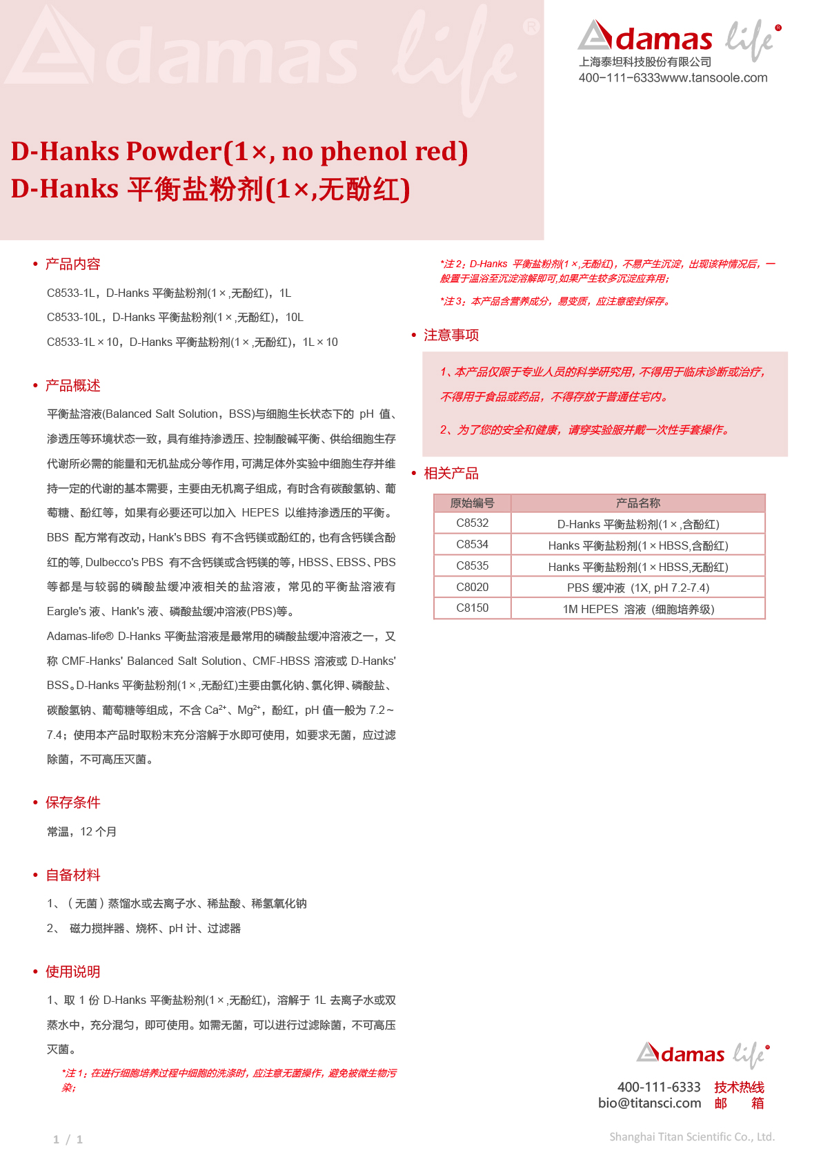 D-Hanks平衡盐粉剂 (1×, 无酚红)|D-Hanks Powder (1×, no phenol red)|Adamas life|1 L×10