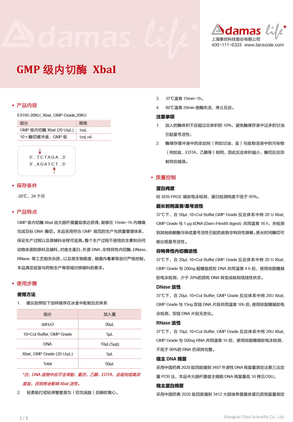 GMP级内切酶 XbaI|XbaI, GMP-Grade|Adamas life|20 KU