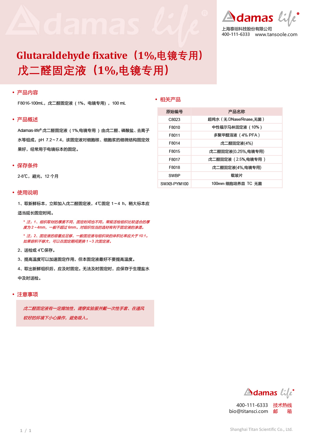 戊二醛固定液(1%,电镜专用)|Adamas life|100mL