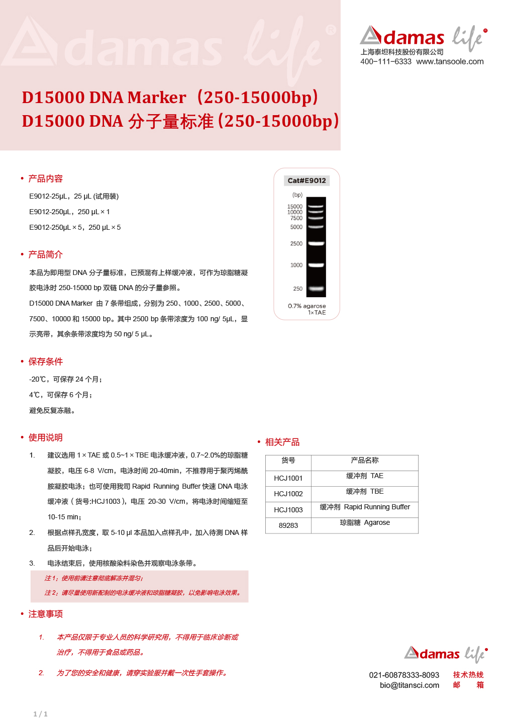 DNA分子量标准 D15000 DNA Marker(250-15000bp)|D15000 DNA Marker(250-15000bp)|Adamas life|250μL×5