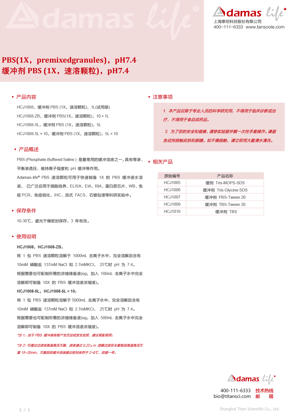缓冲剂 PBS(1×,premixed granules),pH7.4|PBS(1×,premixed granules),pH7.4|Adamas life|1 L×10