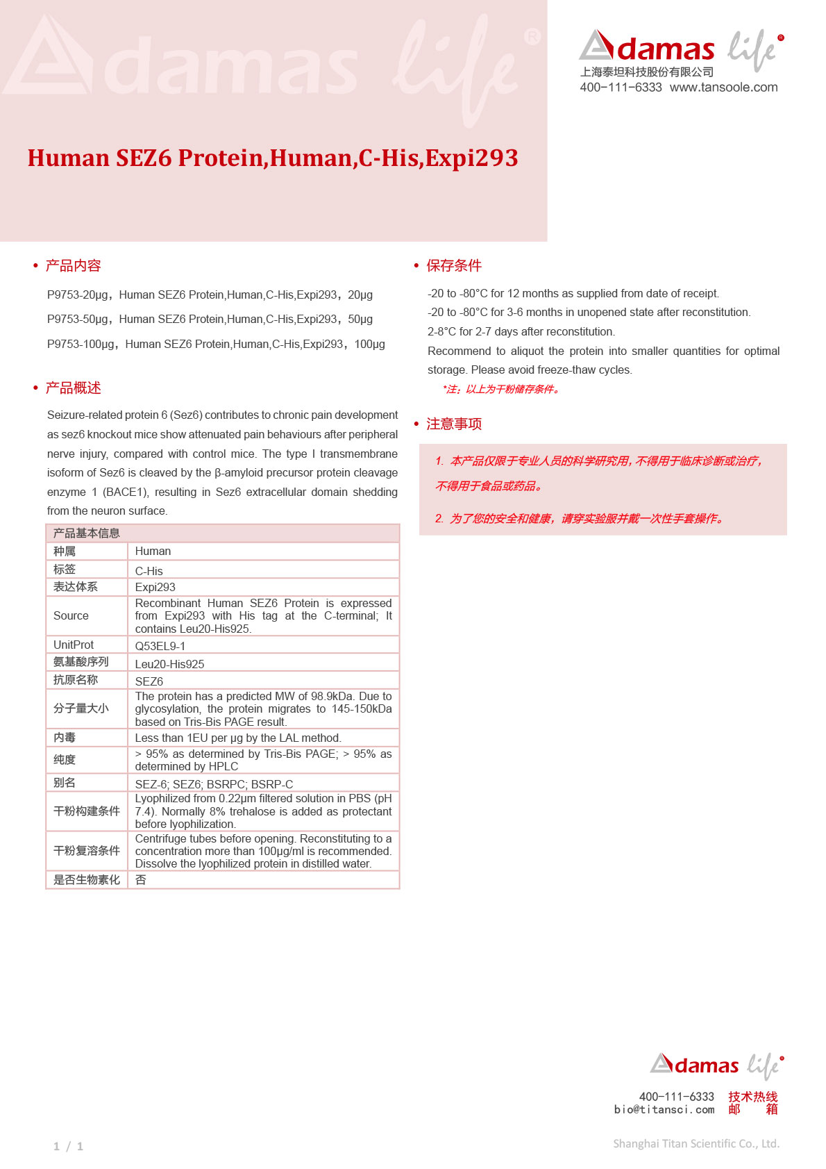 重组蛋白Human SEZ6 Protein, Human, C-His, Expi293|Adamas life|50 μg