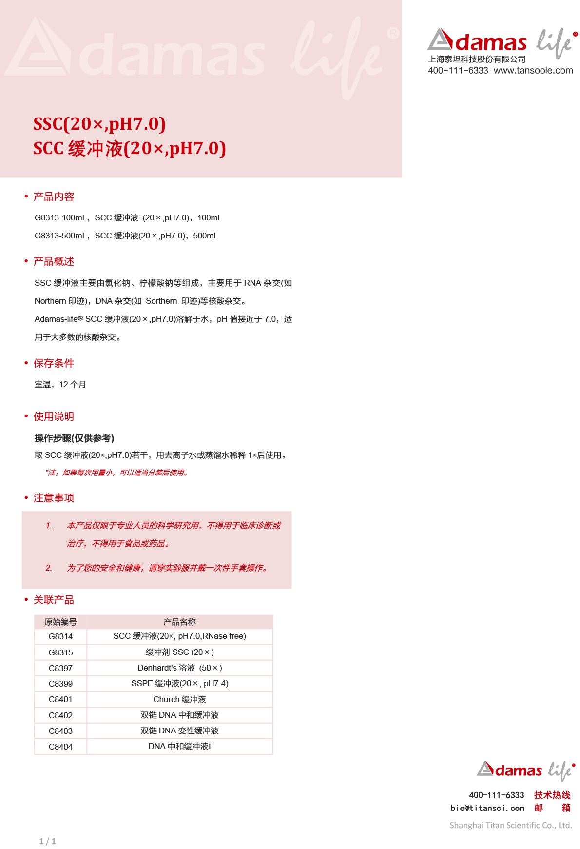 SSC缓冲液 (20×, pH 7.0)|SSC (20×, pH 7.0)|Adamas life|100 mL