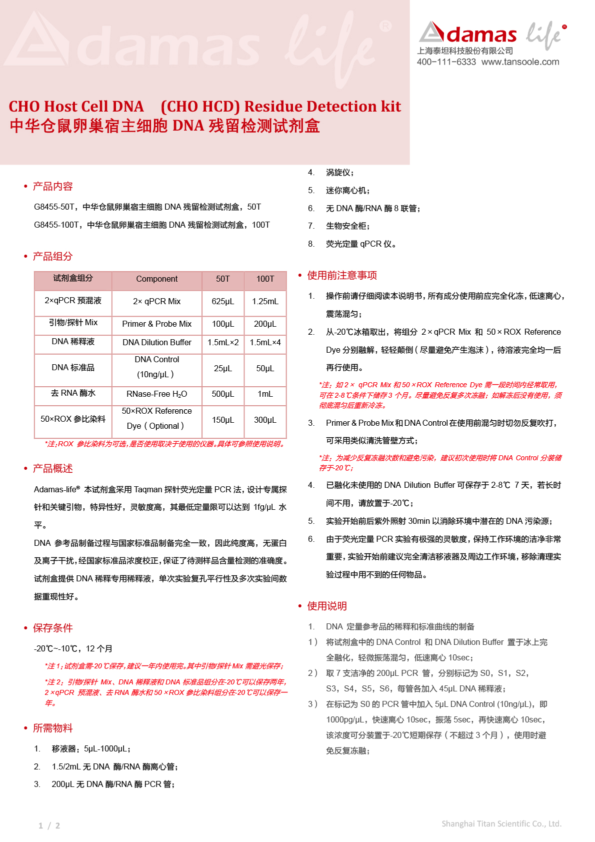 中华仓鼠卵巢宿主细胞DNA残留检测试剂盒|CHO Host Cell DNA (CHO HCD) Residue Detection Kit|Adamas life|100 T