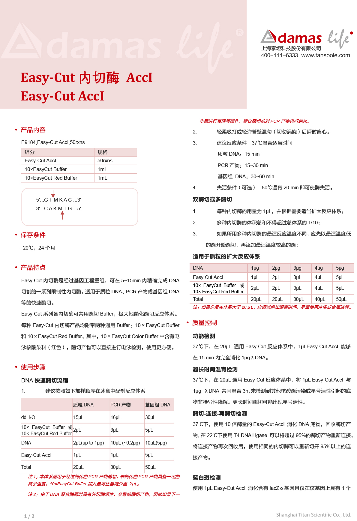 Easy-Cut内切酶 AccI|Easy-Cut AccI|Adamas life|50 rxns