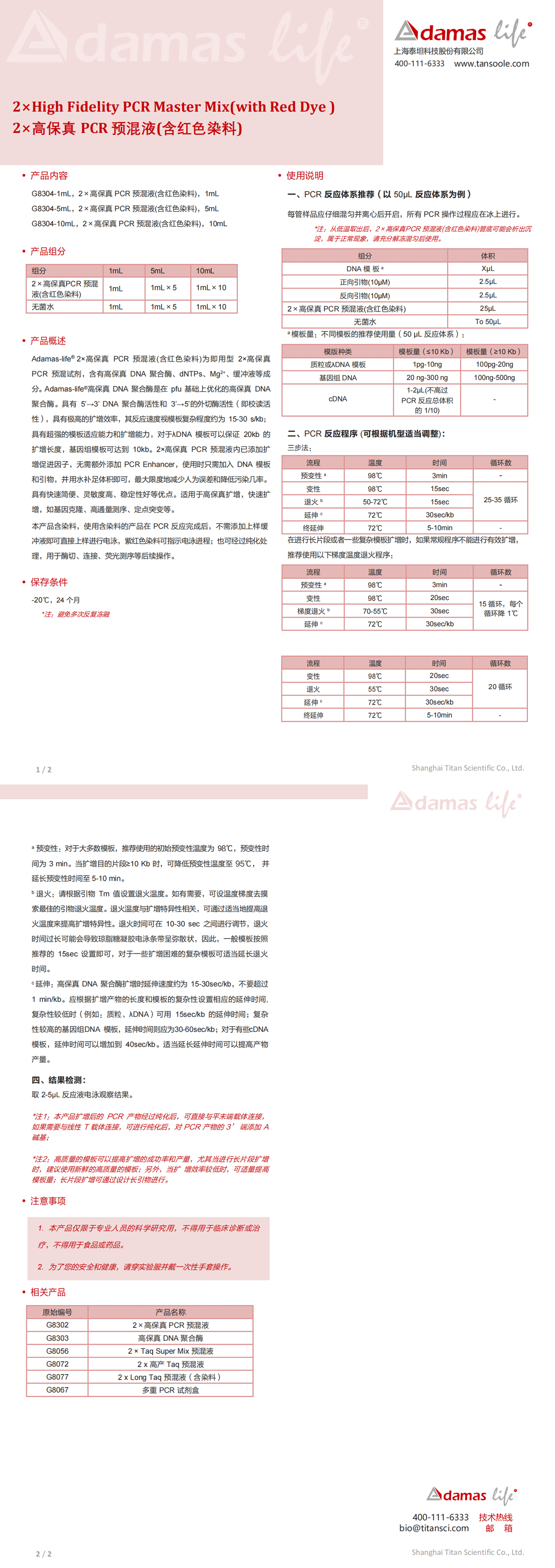 2×高保真PCR 预混液 (含红色染料)|2×High Fidelity PCR Master Mix (with Red Dye )|Adamas life|1 mL×5