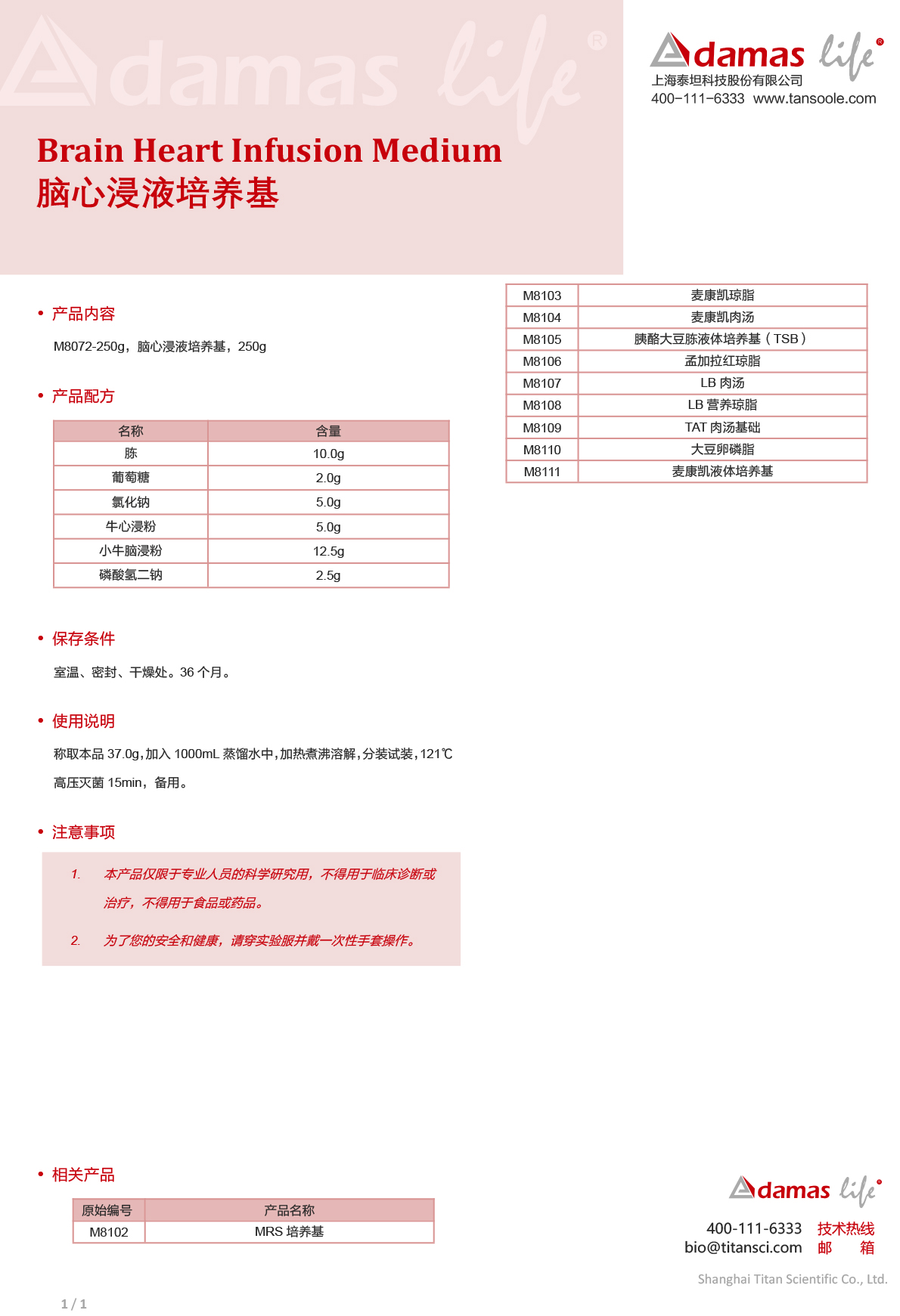 脑心浸液培养基|Brain Heart Infusion Medium|Adamas life|100 g