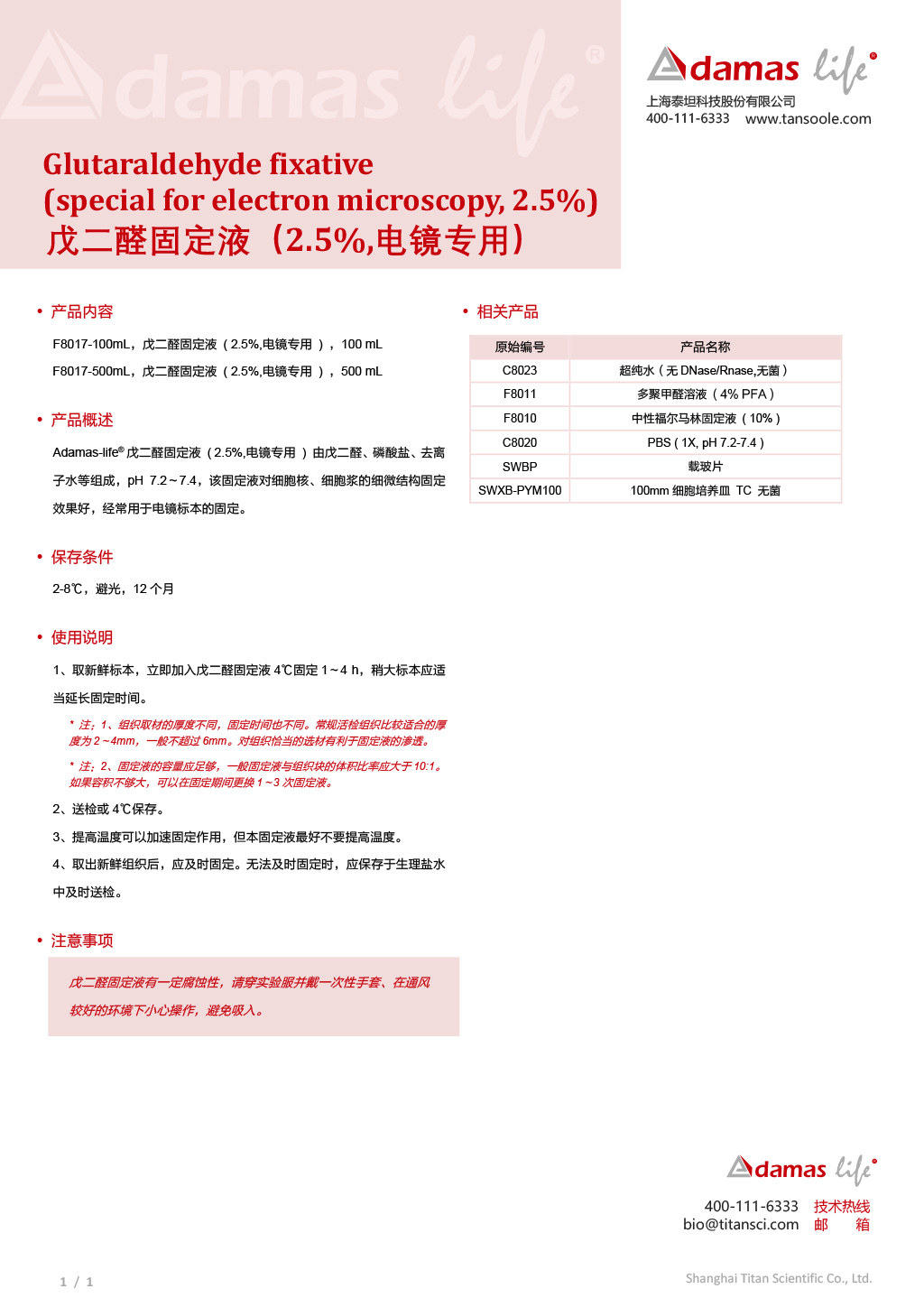戊二醛固定液(2.5%,电镜专用)|Glutaraldehyde Fixative (special for electron microscopy, 2.5%)|Adamas life|500mL